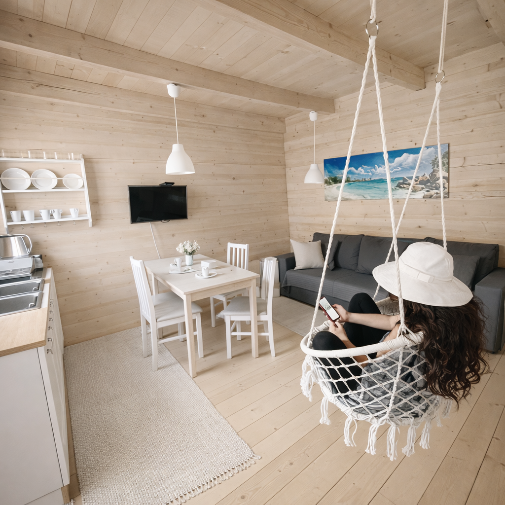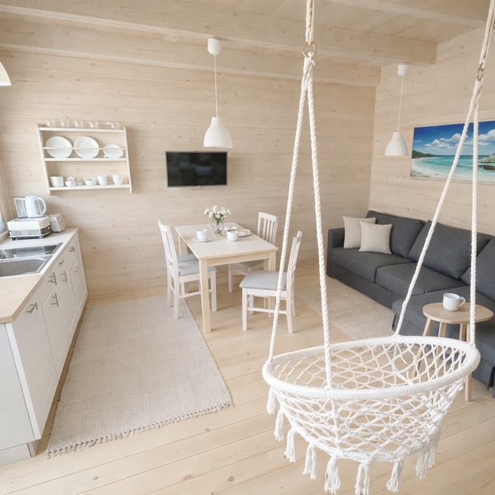 Jedes von ihnen ist aus Fichtenstämmen gebaut, die ein einzigartiges Mikroklima bieten, das zur Erholung und Regeneration beiträgt. Ihre Ästhetik macht sie sehr gemütlich, sodass der Aufenthalt in ihnen ein reines Vergnügen ist. Sie sind mit allen notwendigen Annehmlichkeiten ausgestattet, um den Gästen einen komfortablen Aufenthalt zu gewährleisten. Ergänzt wird alles durch eine geschmackvolle Inneneinrichtung im skandinavischen Minimalismus. Auch für Familien mit Kindern sind die Ferienhäuser bestens geeignet.