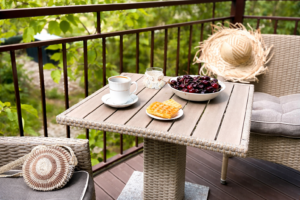 Balkon: Wyposażony w meble ogrodowe (stolik i krzesełka).