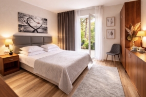 Wyposażenie: Toaletka, szafa, stolik z krzesełkami, lodówka i czajnik. TV, internet WI-FI (światłowód).